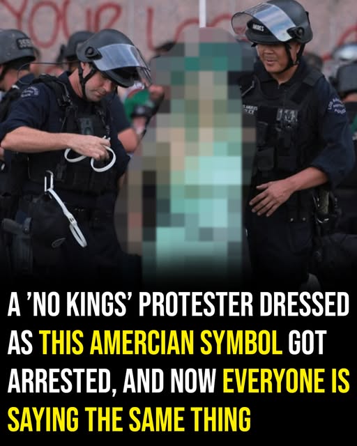 She had arrived in downtown Los Angeles carrying far more than her costume could ever suggest. Draped in layers of foam and fabric, she wore the familiar symbols of liberty: a plastic torch in hand, a copper crown atop her head, and a message emblazoned in silent defiance: no kings, no unquestioned rulers. Yet what she carried inside herself—the conviction, the weight of protest, the history of voices demanding justice—was far heavier than any prop or garment. Hours later, that same figure confronted a line of armored officers, her wrists bound in plastic, the torch gone, but her presence undiminished. In that instant, thousands of smartphone cameras rose, capturing a single human being as she embodied a concept larger than any individual: freedom, resistance, and the price of standing for something greater than oneself.